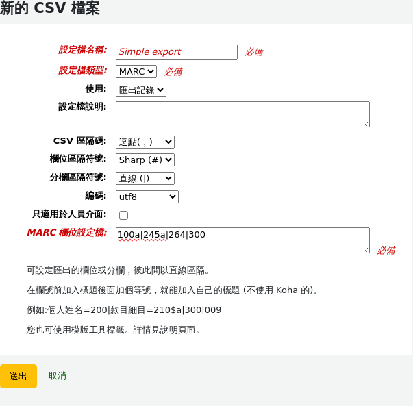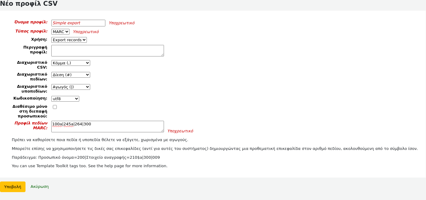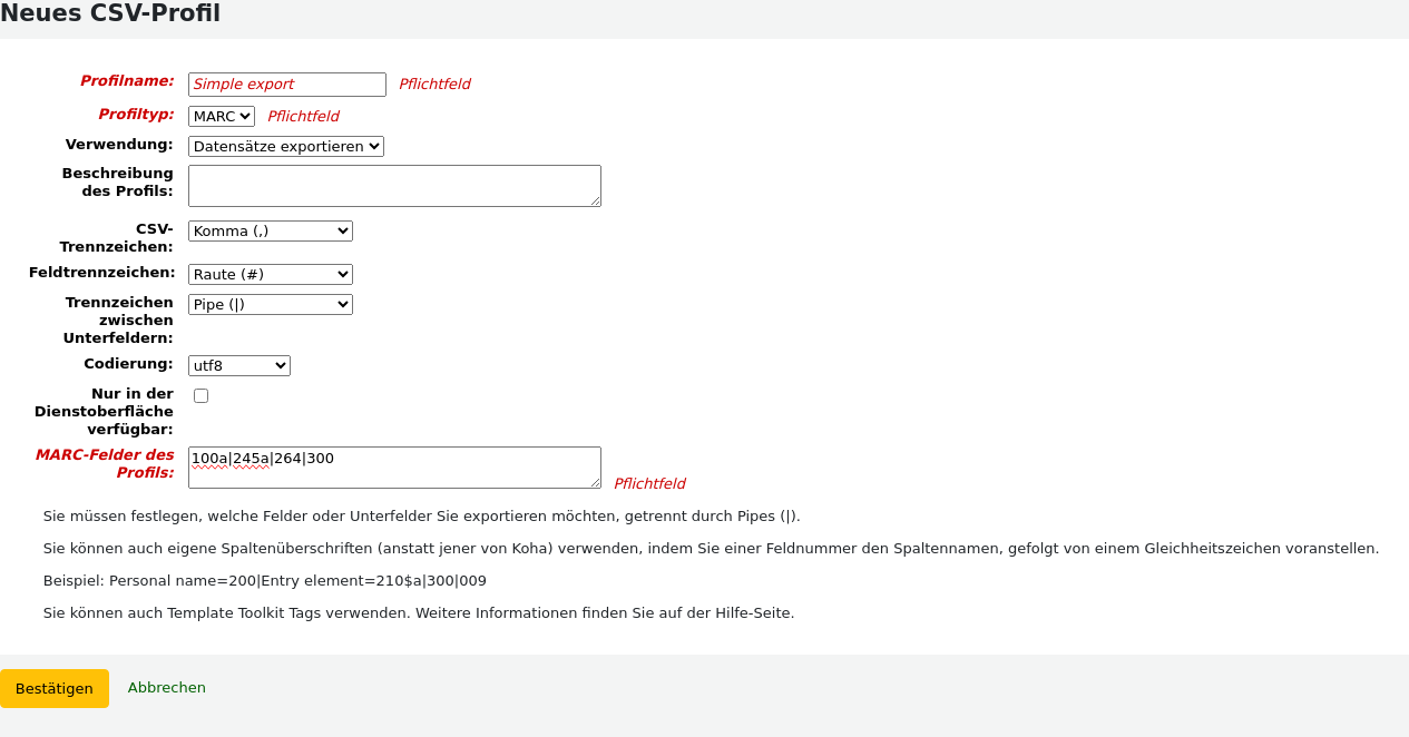 Profile MARC fields: 100a|245a|264|300